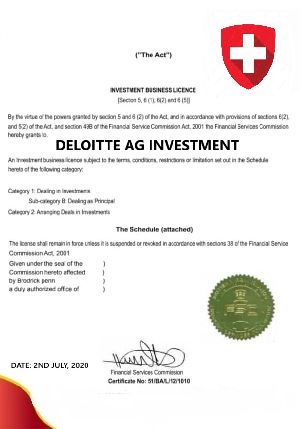 At Deloitte AG Investment Company, we engage in diverse business ventures designed to generate sustainable income and ensure consistent, timely payouts to our clients, maintaining a seamless and complaint-free experience. Our portfolio spans multiple sectors, including real estate management, stock exchange, cryptocurrency investment, oil management, and various trading activities. We offer four distinct investment levels, tailored to help our customers maximize their profits with confidence and peace of mind. Our commitment to transparency and excellence ensures that your investments are secure and consistently rewarding.